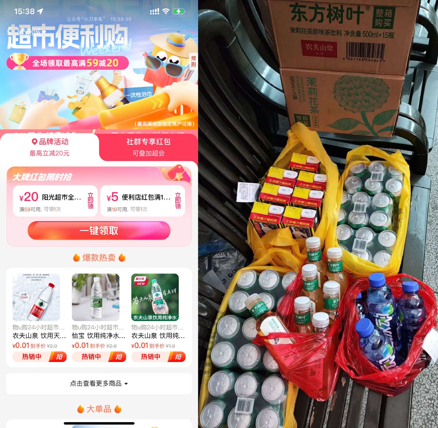 饿了么APP搜索“54321”->有59-20亓 和 10-5亓券,可叠加店铺满减和商品优惠,十几块撸一大堆实物